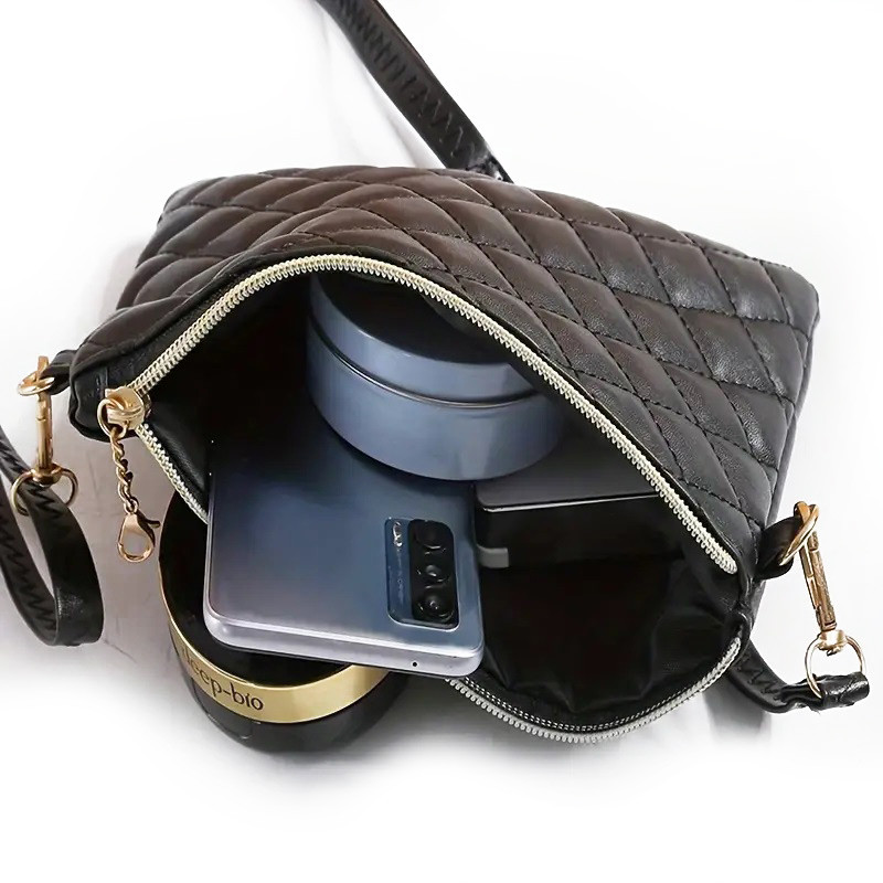 Dámská kabelka s luxusním vzhledem má hlavní část krytou zipem. Popruh přes rameno je odnímatelný, kování je zlaté barvy.
