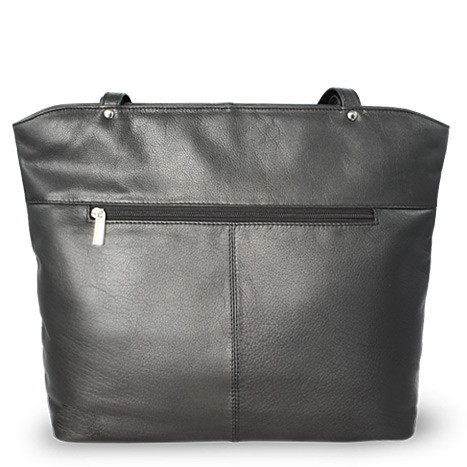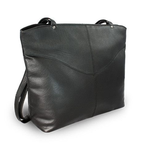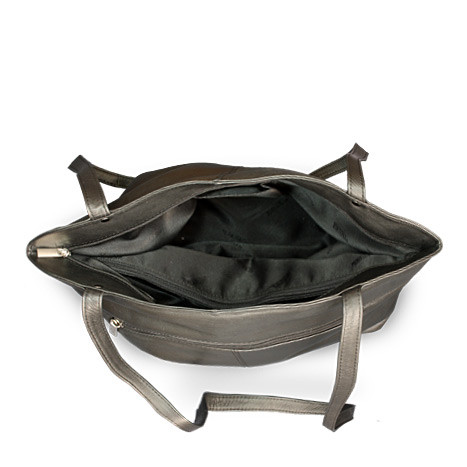 Luxusní velká kožená kabelka české značky Arwel má dva popruhy a je uzavíratelná na zip. Obsahuje dvě hlavní vnitřní kapsy rozdělené zipovou přepážkou. Uvnitř se nachází zipová kapsička, kapsa na mobil, odepínatelný kroužek na klíče a malé zrcadlo v koženém obalu. Na venkovní zadní straně je umístěna další zipová kapsa.