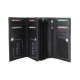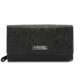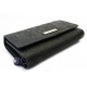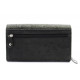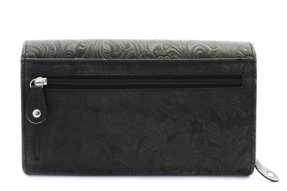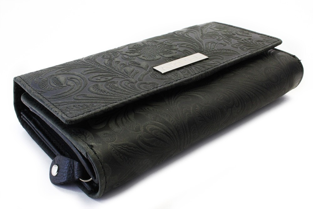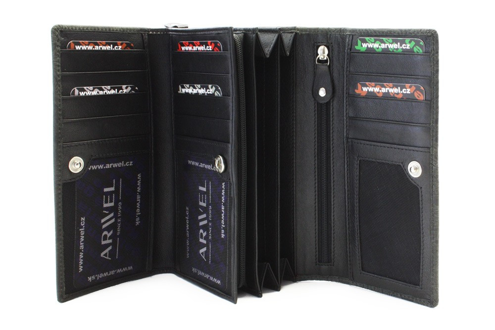 Podlouhlá, bohatě vybavená, kožená klopnová peněženka nabízí 2 přihrádky na bankovky, jeden velký dělený zipový mincovník, 12 přihrádek na kreditní karty, vizitky či doklady, tři průhledné okna na vkládání fotek a pět otevřených vnitřních kapes. Na zadní straně je zipová kapsa. Peněženka má zapínání na klopnu s ozdobným kováním jištěnou drukem. Šití je v barvě kůže.