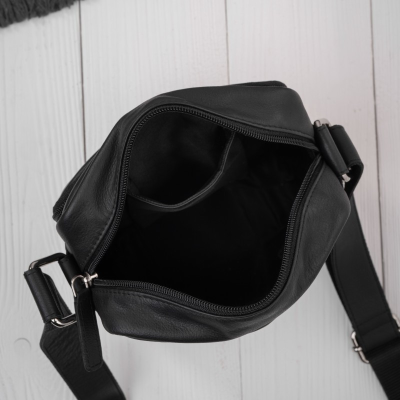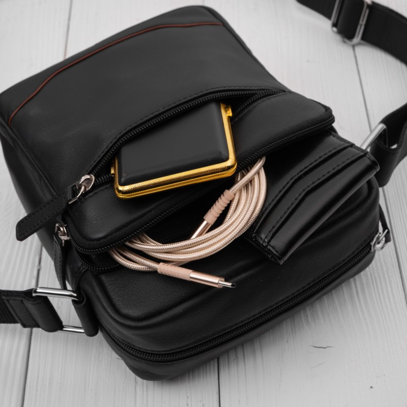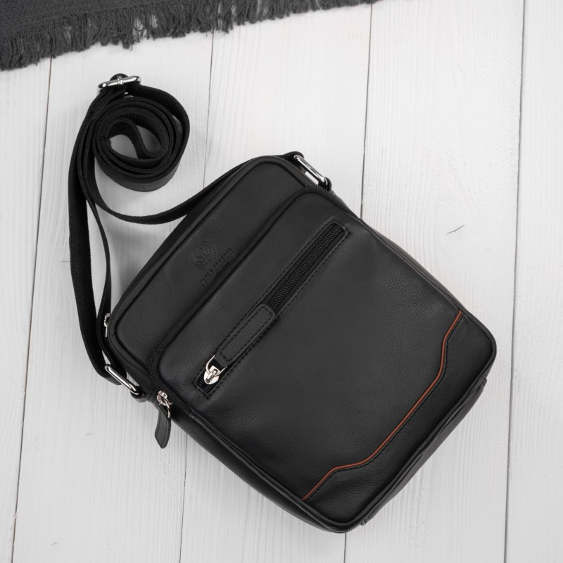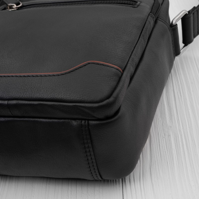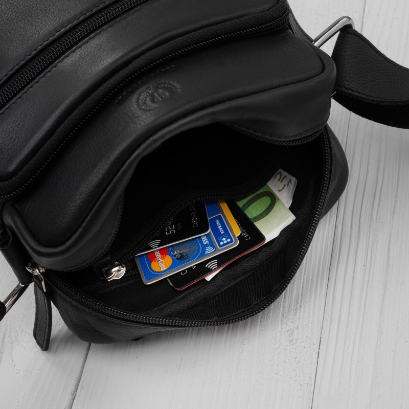 Kvalitní černá kůže vyniká svou odolností a postupem času získává přirozenou patinu, která podtrhuje její luxusní charakter. Design je oživen decentním koňakovým detailem ve spodní části, jenž dodává modelu osobitý vzhled a jemný kontrast. Promyšlené vnitřní řešení nabízí jednu hlavní komoru doplněnou o celkem pět praktických kapes, které umožňují přehledné uložení telefonu, dokladů, peněženky i dalších nezbytností. Samostatná kapsa na telefon zajišťuje rychlý přístup, zatímco pevné zipy chrání obsah během nošení. Díky kompaktním rozměrům a nízké hmotnosti je taška ideální pro každodenní použití – do města, na schůzky i cestování. Nastavitelný ramenní popruh umožňuje pohodlné nošení. Odolné stříbrné kování podtrhuje celkový moderní vzhled a zajišťuje dlouhou životnost.