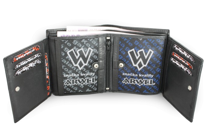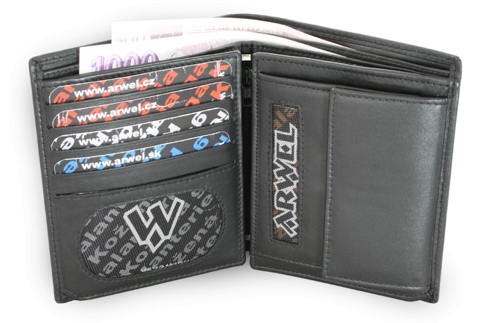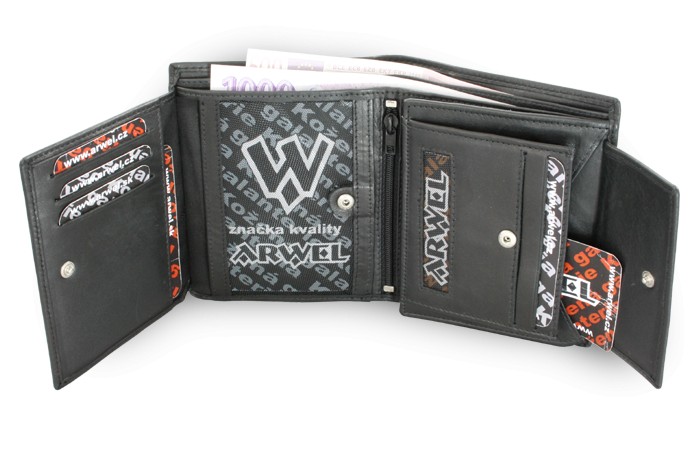 Pánská kožená peněženka Arwel v černé barvě. Peněženka je rozkládací a obsahuje 2 přihrádky na bankovky, kapsa na mince, 12 kapes na kreditní karty, 2 vnitřní a 2 průhledné kapsy velikosti osobních dokladů a jedna zipová kapsa.Základní rozměr 10,5 x 12,5 cm.Materiál NAPPA, barva černá.