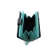 2 přihrádky na bankovky, 12 kapes na kreditní karty, 3 vnitřní kapsy, zipová zdvojená kapsa na mince a 1 průhledná kapsa samostatně ve velikosti osobních dokladů. Šití v modré barvě.
