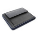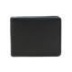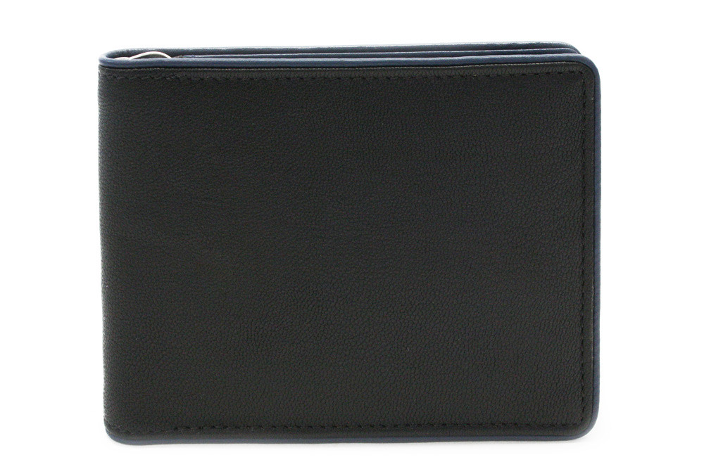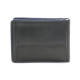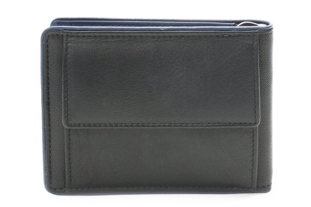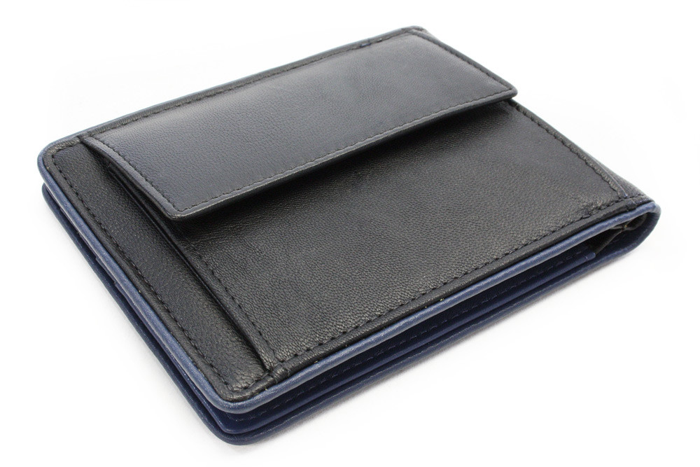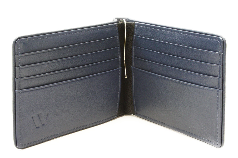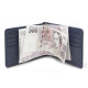 Pružina pro uchycení bankovek, 8 kapes na kreditní karty, 2 vnitřní kapsy a venkovní kapsa na mince. Šití v modré barvě.