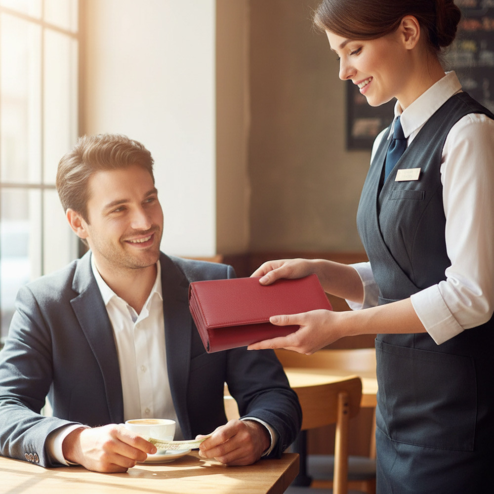 Kožená číšnická peněženka české značky Arwel v nepřehlédnutelné červené barvě je navržena pro maximální přehlednost a každodenní pohodlí při práci.