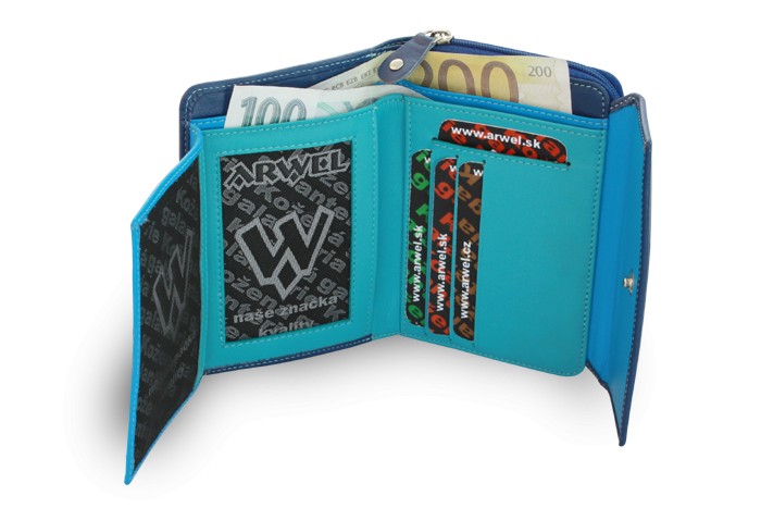 Dámská kožená peněženka Arwel v modré barvě. Peněženka obsahuje pod klopnou po rozevření 2 přihrádky na bankovky, 8 kapes na kreditní karty, 1 skrytá a dvě průhledné kapsy, pod zipem umístěným po obvodu zdvojená zipová kapsa na mince s 2 všitými a jednou zipovou kapsičkou.Základní rozměr 10 x 14 cm.Materiál NAPPA, venkovní barva modrá, vnitřní část peněženky složený ze 3 odstínů modré barvy.