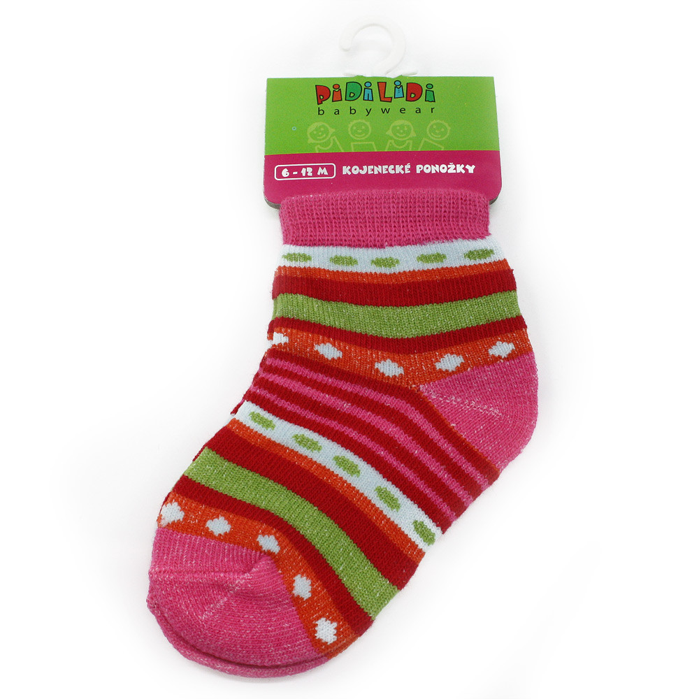 Kojenecké barevné ponožky mají pohodlný volný lem a plochý šev na špici.