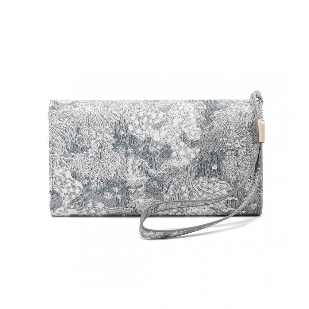 Podlouhlá klopnová peněženka nabízí dvě prostorné přihrádky na bankovky, dvě průhledné kapsy, jednu bezpečnou zipovou kapsu na mince, dvanáct kapes na karty pro úhledné uložení kreditních či členských karet. Součástí peněženky je odnímatelné poutko. Na přední straně je kovový motiv.