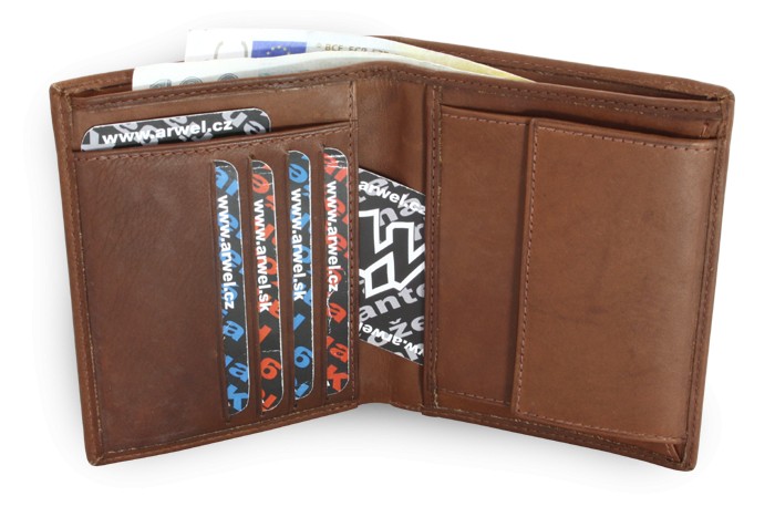 Pánská kožená peněženka Arwel v tmavě hnědé barvě. Peněženka obsahuje 2 přihrádky na bankovky , kapsa na mince, 4 kapsy na kreditní karty, 3 boční kapsy velikosti osobních dokladů. Základní rozměr 10 x 12 cm. Materiál SVG, barva tmavě hnědá.